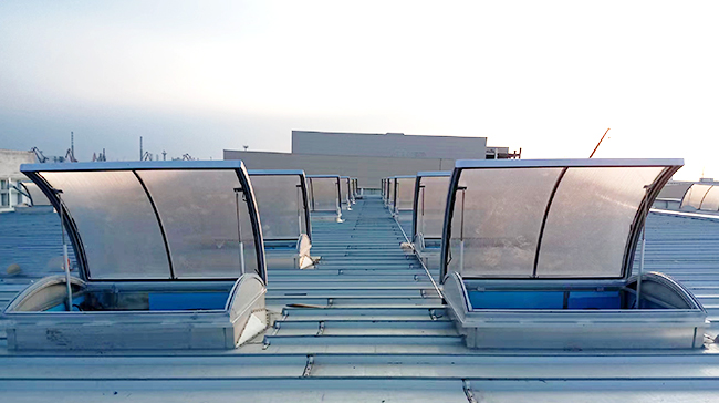 圓拱形的設計,外觀優(yōu)美、通風排煙兼顧自然采光,可實現(xiàn)消防聯(lián)動控制,開啟角度一般為30度到45度***開啟角度為90°。 夏季有利于排水,冬季不積雪。采用單開或?qū)﹂_形式。天窗啟閉按群組控制,每組天窗數(shù)根據(jù)天窗數(shù)量及控制距離決定。