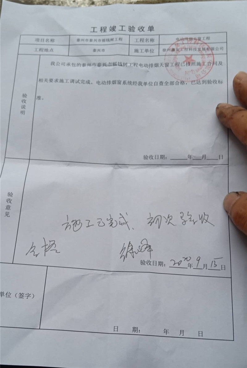 2020年9月19日,泰州泰興搖錢樹工程電動排煙窗改造項目完成初步驗收。