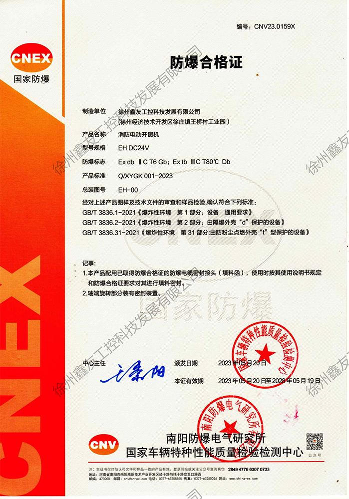 電動鏈式開窗機防爆合格證書