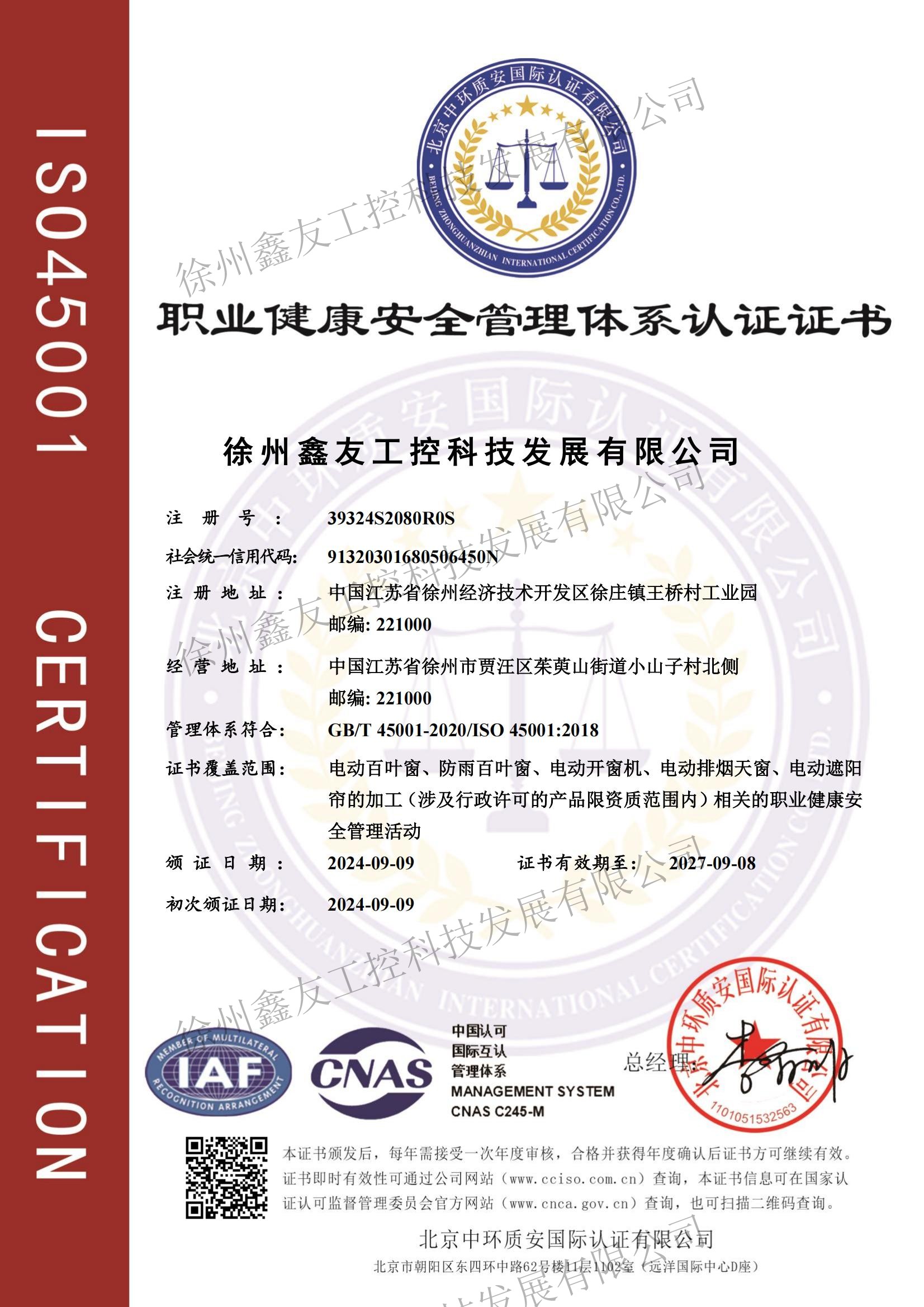 職業(yè)健康安全管理體系認(rèn)證證書
